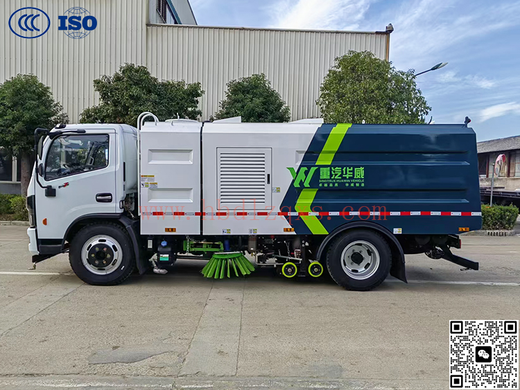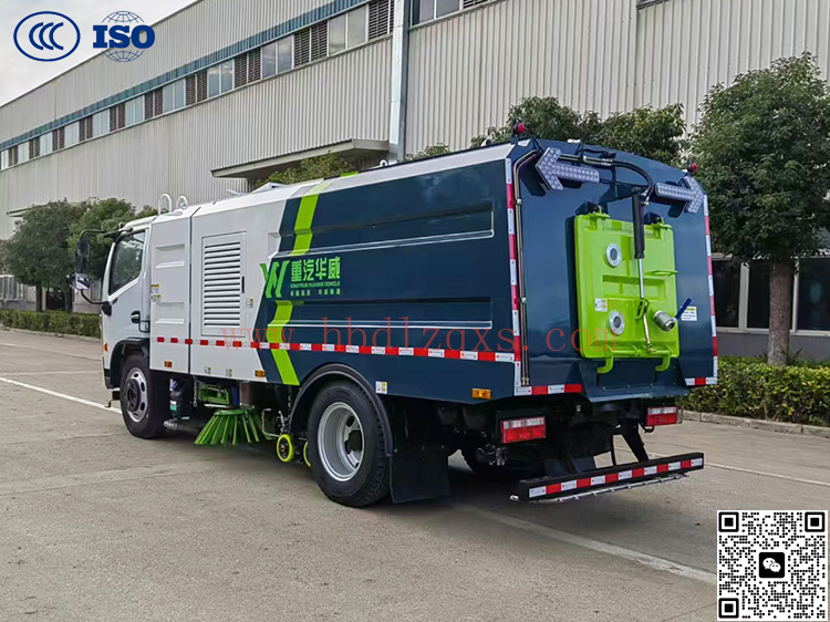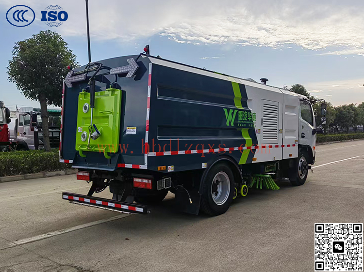高效洗扫车利用高压水流及倾斜扫刷将垃圾扫至吸盘前面,在风机产生的负压作业下,风流在闭合的回路中将垃圾吸入垃圾箱中贮存,整个作业过程均是物理原理,不会产生化学废料或垃圾外泄对环境的二次污染,同时,后喷雾的降尘有效的降低了空气中粉尘浓度, 解决粉尘污染问题。洗扫洁净度高,该车型齐全的功能解决不同路面环境的作业,一次作业洗扫效率达96%以上,定点冲洗功能、洗扫功能、路沿清洗功能、后喷雾功能、低压冲洗功能以及采用的中置吸盘+左右侧喷杆清洗方式,可对路面、沟缝、弯道处、路沿上等处的灰尘、垃圾均能处理干净,确保环境干净、整洁。