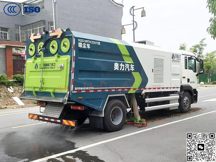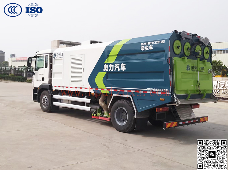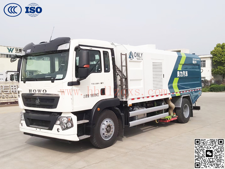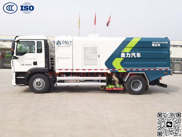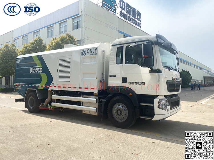重汽豪沃18T吸尘车,是由吸尘作业部分及行走部分等组成,包括二类汽车底盘、副梁、副发动机、风机、吸盘、过滤系统、清水箱、检修仓,集尘箱、液压控制系统、电控系统、气路系统等。