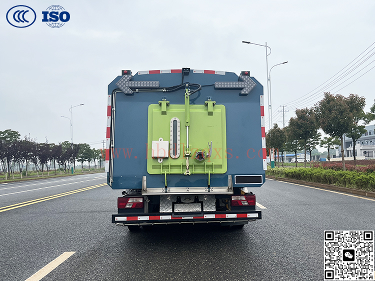 高效洗扫车利用高压水流及倾斜扫刷将垃圾扫至吸盘前面,在风机产生的负压作业下,风流在闭合的回路中将垃圾吸入垃圾箱中贮存,整个作业过程均是物理原理,不会产生化学废料或垃圾外泄对环境的二次污染,同时,后喷雾的降尘有效的降低了空气中粉尘浓度, 解决粉尘污染问题。洗扫洁净度高,该车型齐全的功能解决不同路面环境的作业,一次作业洗扫效率达96%以上,定点冲洗功能、洗扫功能、路沿清洗功能、后喷雾功能、低压冲洗功能以及采用的中置吸盘+左右侧喷杆清洗方式,可对路面、沟缝、弯道处、路沿上等处的灰尘、垃圾均能处理干净,确保环境干净、整洁。
