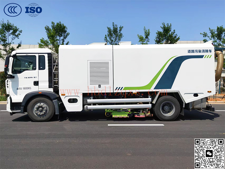 18吨重汽豪沃道路污染清除车,又叫深度保洁车,是用于市政环卫、景区道路等场景的专业清洁车辆,涵盖洗扫车、污染清除车等多种类型,具有高效清洁、污水回收等功能。是我司自行设计开发、具有完全自主知 识产权、技术水平国内领先的全新一代集常规保洁和深度清洁于一体的多功能环 卫车;本车独有的侧边吸功能填补了国内现阶段环卫车只能清洗路边而无法有效 回收清洗路边后遗留污水的空白,针对市场上常规清洗设备的功能短板,聚《一 种清扫车吸盘用高压水射流侧旋转装置》、《一种清扫车吸盘用高压水射流组合旋 转装置》、《一种清扫车用组合吸盘装置》等多项专利技术,结合国内外先进的技 术以及优质零部件,采用优良的制作工艺及产品质量控制标准打造而成,彻底解 决了现有环卫清洗类车辆无法有效的对路面积垢、板结、油污、生化品等污染物 清除的难题,一次清洗即可还原路面本色,从源头上遏制住道路扬尘,对道路降 噪、排水性、透水性沥青路面机能恢复、延长其使用寿命及降低PM2.5扬尘污染 有重大意义,也是抢险救援、抗霾降霾等领域的重要利器。